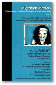 This presentation will examine the theological and ethical challenges made by ecofeminists and how these can be used to issue a call for justice for the women on the border. Please join us at Perkins School of Theology, Prothro Great Hall, at 6:30pm at SMU in Dallas, Texas.